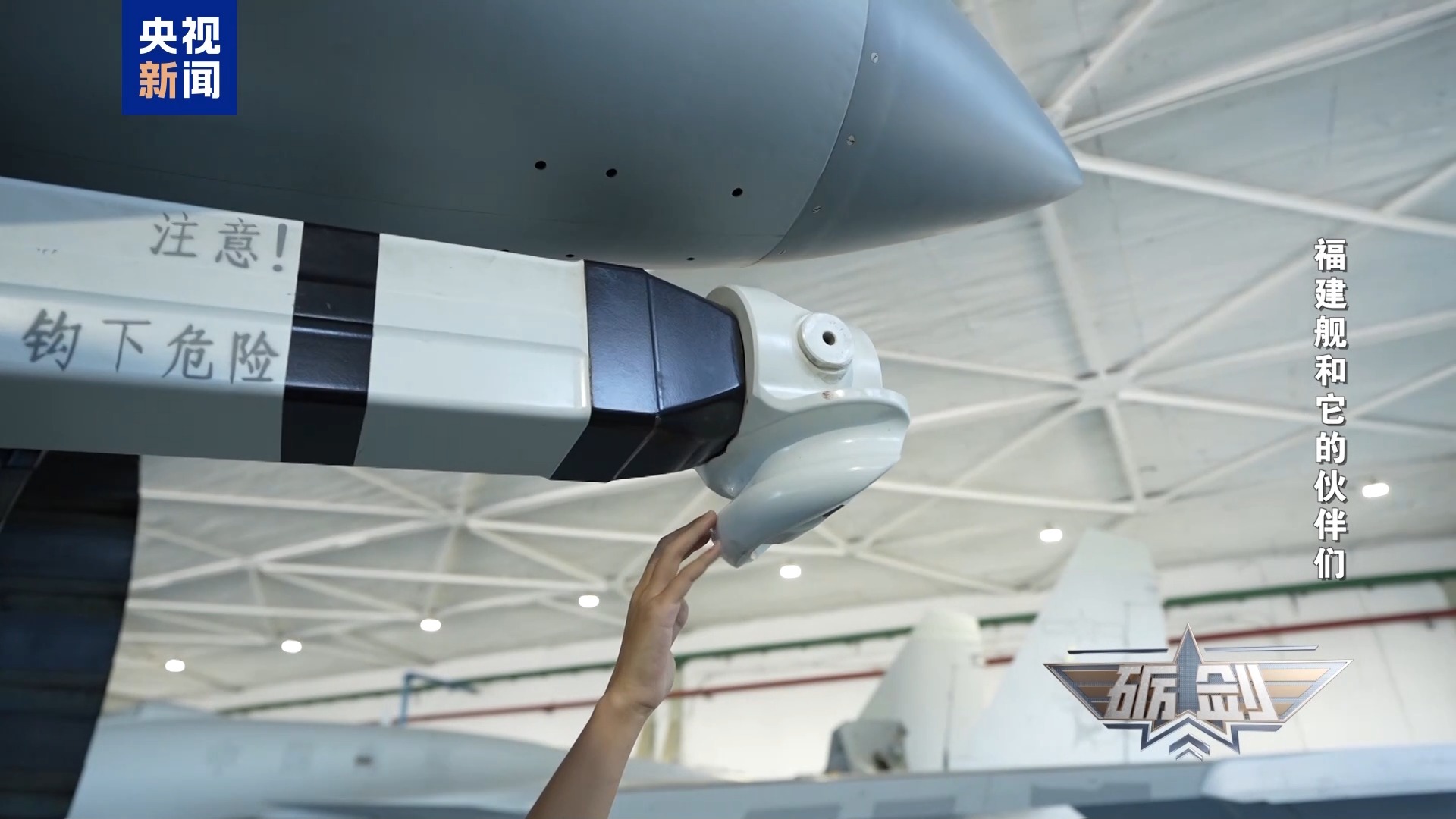 在沈飞的机库,记者看到两架歼15-T飞机一前一后停放着,歼-15T的“T”是汉语拼音“tán”的首字母。弹射杆是歼-15T飞机为弹射起飞专门量身制造的。它能直接钩住航母甲板上的电磁弹射器,瞬间就能把几十吨重的歼-15T从静止的状态加速到几百公里每小时,拽着战机冲离甲板。